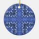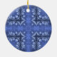 A pretty blue pattern of candles and swirls decorate this ceramic holiday ornament.