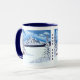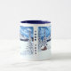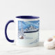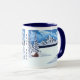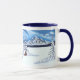 A mug with a beautiful winter scene including mountain, rustic cabin and evergreens after a heavy snow fall. The image and text can be personalised. Original artwork by W.B.