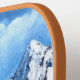 A pickleball paddle with a beautiful winter scene, including snow covered mountains, evergreens, and rustic cabin. The image and text can be personalised. Original artwork by W.B.