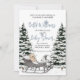 This whimsical watercolor illustrated baby shower invitation features a snowy winter scene with a magical carriage, a teddy bear, and ice skates, setting the scene for your magical Winter Wonderland Baby Shower.