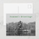 This special holiday postcard features a photograph, presented in black and white, of beautiful evergreen trees by a lake on a snowy winter day. It transmits the peace and tranquillity that comes with a fresh blanket of snow and the fairyland it creates -- truly a Winter Wonderland! Looking closely, the viewer will note that the photo was taken as snow was falling (and falling), adding unique effects to this idyllic scene. Happy Holidays!
