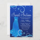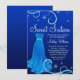 An elegant winter themed sweet 16 birthday party invitation. Featuring blue snowflake swirls and a formal dress on a navy blue background.