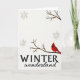 The words "WINTER wonderland" are written below in different fonts: "WINTER" is bold, and "wonderland" is more fancy. The mood of the card is peaceful, happy, and elegant. The cardinal's red color represents happiness and strength. This design combines simple graphics with meaning to create a cozy winter feel. It looks like a special handmade creation made with love.