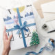 This enchanting Christmas wrapping paper brings to life a cosy winter village scene. Snow-dusted homes with warm, glowing windows are nestled among twinkling Christmas trees and cheerful snowmen, creating a festive holiday landscape. A gentle snowfall blankets the scene, while Moravian stars hang overhead, casting a soft, magical light. A tiny fairy adds a sprinkle of whimsy as Santa’s sleigh glides across the starry night sky above. With its rich details and classic holiday charm, this wrapping paper transforms every gift into a charming winter wonderland waiting to be unwrapped.