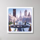 This captivating artwork showcases a magical winter scene in the heart of the city. Snow-covered trees line a serene park, with bridges and pathways adorned in festive decor. Christmas trees sparkle with ornaments and glowing stars, creating a warm holiday ambiance against the backdrop of iconic skyscrapers. The cityscape combines the peacefulness of nature with the urban charm, offering a perfect blend of festive beauty and winter serenity.