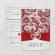 Set the tone for your Christmas or winter wedding with this inexpensive, yet luxuriously elegant red and silver grey floral FAUX glitter damask pattern wedding RSVP card that has a background of assorted white snowflakes on it and a PRINTED red ribbon and bow with a pair of diamond jewels and FAUX red glitter joined hearts on it. It would be perfect for a winter wonderland theme or for a Christmas or New Year's Eve wedding with a red and silver colour scheme. It has fun mad-lib responses that ask your guests to reply that they'll be there with bells on, will be there with no bells on, will be there...undecided on the bells, or with their regrets that say they will not be there, as they heard there would be people wearing bells, or they will not be t here, regardless of the bell controversy. What better time to use this funny RSVP card than with your winter or Christmas wedding? People may actually show up with bells on! ***PLEASE NOTE there are no raised elements on this invitation. Everything is printed flat. ***PLEASE NOTE that if you change the fonts or size of the fonts, it may alter how your invitation prints. It will print the way you see it on your monitor, so if you have alignment issues, or sizing problems, please contact me for help BEFORE you order. I will not see your invitation once you order it, and Zazzle will NOT edit anything (typos, alignment, etc.). If you require assistance or would like any other matching items, or a different colour combination, please email your request to niteowlstudio@gmail.com.