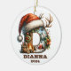 Celebrate the season with this enchanting ornament featuring the rustic letter "D," topped with a festive Santa hat and reindeer antlers. Inside the letter, is a winter scene, complete with a campfire, snow-covered mountains, pine trees, and a charming tent, creating an inviting outdoor ambiance. Holly leaves, pinecones, and a holiday wreath add extra cheer, making this ornament ideal for nature lovers. Personalised with a custom name and year, this unique keepsake blends rustic charm with holiday magic for a memorable addition to your decor.