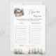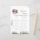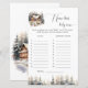 Add a fun and festive touch to your baby shower with this charming 'Name That Baby Tune' game card. Featuring a beautiful winter scene with a cosy cabin, deer, and snow-covered trees, this game is a perfect fit for a winter-themed celebration. Guests will love guessing the artists of popular songs that include the word 'Baby' in the title. This card is a delightful activity that brings a bit of friendly competition and lots of laughs to your event. It's a great addition to your baby shower games and a wonderful way to entertain guests.