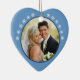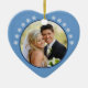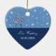 This ornament is a great keepsake of a wedding with a winter wonderland theme. The front features a photo of the wedding couple in a circle with small white snowflakes around. The back contains the wedding date and a couple of stylish pine trees with snow on them. Tiny snowflakes floating around add to the whimsical scene. Elegant yet modern design. This ornament makes a great custom gift for a married couple.