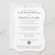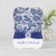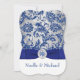 Set the tone for your Christmas or winter wedding with this inexpensive, yet luxuriously elegant royal blue, silver grey floral FAUX glitter damask pattern bracket shaped wedding invitation that has a background of assorted white snowflakes on it and a PRINTED royal blue ribbon with a round crystal jewels and silver look brooch on it. It would be perfect for a winter wonderland theme or for a Christmas or New Year's Eve wedding. ***PLEASE NOTE there are no raised elements on this invitation. Everything is printed flat.***PLEASE NOTE that if you change the fonts or size of the fonts, it may alter how your invitation prints. It will print the way you see it on your monitor, so if you have alignment issues, or sizing problems, please contact me for help BEFORE you order. I will not see your invitation once you order it, and Zazzle will NOT edit anything (typos, alignment, etc.). If you require assistance or would like any other matching items, or a different colour combination, please email your request to niteowlstudio@gmail.com.