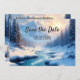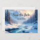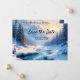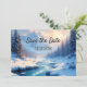 Winter Save the Date card featuring a snow covered winter mountain landscape with a river. On the back is space for your custom photo.
