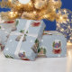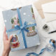 This delightful pattern features an enchanting series of snow globes showcasing cosy, snow-covered cottages surrounded by pine trees. Each snow globe is decorated with festive red bows and intricate details, all set against a soft blue background filled with gently falling snowflakes. The repeating design creates a warm and magical holiday atmosphere, perfect for the winter season.