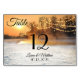 A festive table number card featuring a winter wonderland scene at sunset with festive string lights.