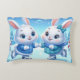 Both bunnies are white with large, expressive blue eyes and rosy cheeks. They wear winter clothes - the bunny on the left has a blue sweater and white earmuffs, while the one on the right wears a teal dress with a matching bow and a blue scarf. Their joyful expressions and the way they hold hands radiate warmth and friendship. The scene is set on a frozen lake, evident from the smooth, icy surface reflecting the twinkling stars above. The background features snow-dusted evergreen trees, adding to the wintery ambiance. A single snowflake hangs from the top centre, likely an ornament, further emphasizing the festive mood. The image is perfect for a Christmas card or a children's book illustration, evoking feelings of joy, friendship, and the magic of the holiday season.