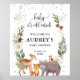 This baby shower welcome sign features a script heading and your custom text surrounded by woodland animals in a winter theme. Use the template form to add your personalisation.