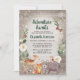 Sweet rustic winter-themed baby shower invitation featuring cute watercolors of woodland animals, florals and greenery and an overlay of gold stars and snowflakes. "Adventure Awaits" and the mother-to-be's name are written in a forest green script.