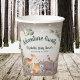 Rustic winter baby shower paper cups with watercolor illustrations of cute woodland animals (bear, fox, deer and owl), florals, greenery and an overlay of gold stars and snowflakes. "Adventure Awaits" and the mother-to-be's name are written in a forest green script.
