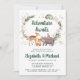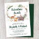 Cute rustic winter-themed couples baby shower invitation featuring watercolor illustrations of woodland animals, florals, greenery and gold stars and snowflakes. "Adventure Awaits" and the names of the mother-to-be and father-to-be are written in a forest green script.
