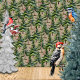A beautiful watercolor-painted woodland forest wrapping paper featuring a repeat pattern of luscious fir and spruce trees forming a forest with winter birds like the red-bellied woodpecker, the eastern bluebird and the red-breasted bullfinch on a Kraft brown colour background.