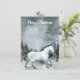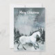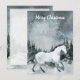 A customisable saying, Merry Christmas card featuring a watercolor painted white horse against a winter woodland forest at dusk. The back of the card features an opaque background for writing a note.