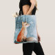 This design features a watercolor illustration of a wintry woodland scene with fox