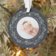 A perfect gift for new parents, this elegant acrylic Christmas ornament features front and back photos encircled by a wreath of dark green leaves and red berries. "[Name's] first Christmas" curves over the top of each photo, with the year beneath. Customise this round ornament with a treasured photo on each side to create a unique keepsake of your baby's first Christmas.