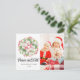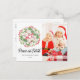 Your family photo is on the right. A modern white poinsettia flower, greenery and red berry wreath is to the left. Holiday greeting is below. Your name and the year follow.