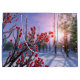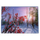 Bright red berries covered in sparkling ice against the backdrop of a glowing winter sunset behind bare trees and dark pines.