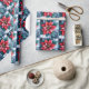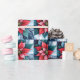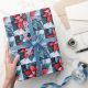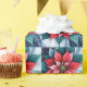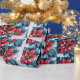 Vibrant red poinsettia flower with delicate pinkish hues at the centre of each petal. It’s set against a cool-toned background that evokes a wintery scene, complete with swirling white patterns resembling gusts of wind.