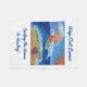 Art features the "Wipe Out Cancer Angel". The painting shows a glimmering orange surfing angel on a blue ocean with a sparkling sun. Sea foam washes up on the sand surrounding the words "Wipe Out Cancer". There is a pink sea shell on the beach. The painting was rendered in acrylic and sprinkled with glitter for texture and shine.