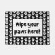 Cute pet mat featuring the words Wipe your paws here. Black and white paw print pattern background. You can customise the text if you so wish.