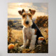 A poster featuring a scene of a Wire Hair Fox Terrier sitting on a hillside among flowers in the countryside in Autumn. This poster is sure to delight anyone who loves Wire Hair Fox Terriers. generativecontent