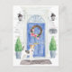 Announce your new address with our stylish announcement featuring a Wire Haired Fox Terrier, blue front door, welcome mat, slate sign, topiaries and a floral wreath set on a grey brick background.