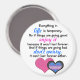 This magnet has an optimistic quote for life. Wonderful reminder to enjoy the good moments in life and persevere through the bad, its all temporary. Makes a great gift. Features two sweet hearts and uplifting pink and blue accents.
