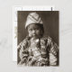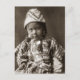Vintage portrait of a Wishham Indian child, seated, wearing a basket like hat, cotton plaid dress, and shell beads decorated with silver dollars. Photo c1910 by Edward S. Curtis, LOC.