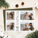 This "Wishing Christmas Blessings Four Photo Holiday Card" is a perfect way to share your cherished family memories in a creative and personalised format. Featuring a modern design with bold, playful typography, the card offers space for four photos, giving you the chance to showcase your year in review. The sleek, minimalist layout with a unique vertical message paired with soft cream tones and a deep green backdrop brings a touch of casual elegance to your holiday greetings. Ideal for those seeking a fun, rustic, and bohemian feel, this card is both timeless and contemporary, ensuring your festive message stands out.