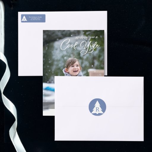 Elegant tissue paper features the words "wishing you a Cool Yule" repeated in a modern script font to make a holiday pattern. The stylish typography design is white on a blue grey background.