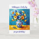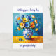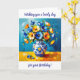 A beautiful birthday card wishing a friend or family member a lovely birthday full of all the things she loves. Birthday card for her with a beautiful impasto style ai illustration of blue and orange flowers in a fancy vase.