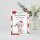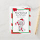 Adorable little hand drawn mouse in a Santa hat holding a candy cane whimsical Christmas postcard. Just add your names and personalised message in the personalise area. Pretty green and red card with snowflakes background.
