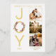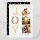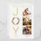 Wishing You Peace, Love and "Joy" Christmas Holiday design featuring a wreath overlaid on the "O" in "Joy" on the left with three photos of your choosing on the right. Simply add the year and your family name to complete the design. The back features a repeat pattern of holiday greenery and berries.