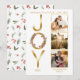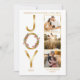 Wishing You Peace, Love and "Joy" Christmas Holiday faux foil gold-toned design featuring a wreath overlaid on the "O" in "Joy" on the left with three photos of your choosing on the right. Simply add the year and your family name to complete the design. The back features a repeat pattern of holiday greenery and berries. Front has a white background. Also available in real gold foil in our shop.