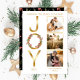 Wishing You Peace, Love and "Joy" Christmas Holiday faux foil gold-toned design featuring a wreath overlaid on the "O" in "Joy" on the left with three photos of your choosing on the right. Simply add the year and your family name to complete the design. The back features a repeat pattern of holiday greenery and berries. Front has a white background. Also available in real gold foil in our shop.