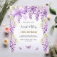 An elegant white and purple gradient background, decorated with lavender coloured wisteria flowers, butterflies and a bow. Personalise and add a name and party details.
