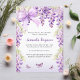 An elegant white and purple gradient background, decorated with lavender coloured wisteria flowers, butterflies and a bow. Personalise and add a name and party details.
