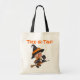 This fun, reusable bag is perfect for trick-or-treating. It features a young witch and her black kitten riding a broom. The words Trick-or-treat at the top are customisable.