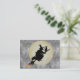 Silhouette of witch on a broomstick with fire coming out of the broom and a black cat perched on the handle against a round full moon.
