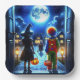 Scary Halloween Plateswith ai art depicting a little boy and girl in a clown and witch costume walking out the house to encountered a scary monster at the end of their sidewalk.