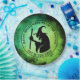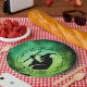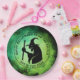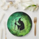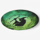 Paper plate featuring a black silhouette of an old witch stirring a cauldron on a black and green background with custom text around the witch.