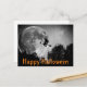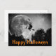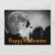 Fun Halloween postcard design features black and white photograph of full moon with flying witch silhouette and customisable text overlay