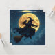 A super cool witch and warlock on a broom in front of a full moon Halloween Personalised card.